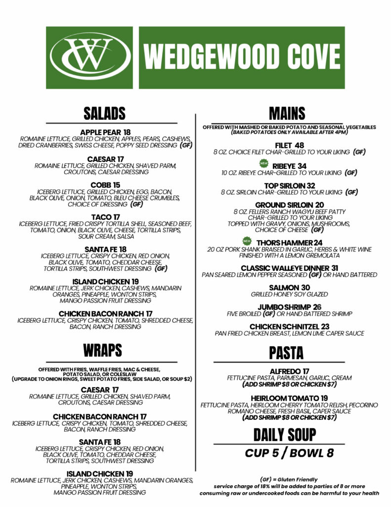 The Cove offers a more casual dining environment with high-top tables, a full 15 seat bar, and big-screen TVs for your sports and entertainment viewing pleasure. The Cove can accommodate up to 75 guests and offers great golf course views with spectacular sunsets! We also have all of your favorite mixed drinks and a broad selection of domestic and regional beers on tap and in the bottle!